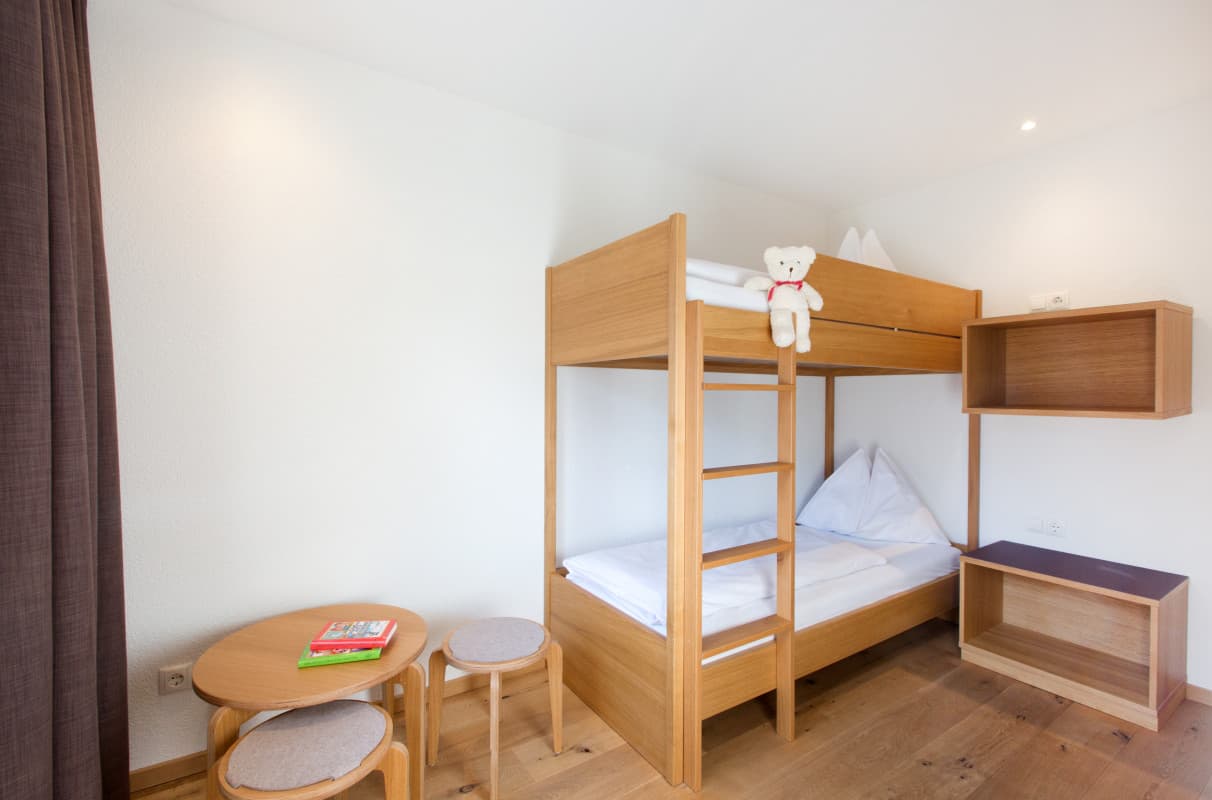 Das Familienzimmer Deluxe 2 ist mit einem Eichenholz-Parkettboden ausgestattet, bietet 2 Schlafzimmer mit Etagenbett für die Kinder sowie einen Balkon oder Terrasse mit Aussicht nach Süden. Gemäß der fam Philosophie wurde bei der Gestaltung der Lagant-Zimmer auf die Bedürfnisse der Familiengäste und die Verwendung natürlicher Materialien geachtet. Die Zimmer sind mit Bad/Dusche, WC, Haarfön, Kosmetikspiegel, flauschigen Bademänteln, ausreichend Stauraum, Schreibtisch mit Hocker, Safe, modernem Flatscreen, WLAN und Telefon ausgestattet.