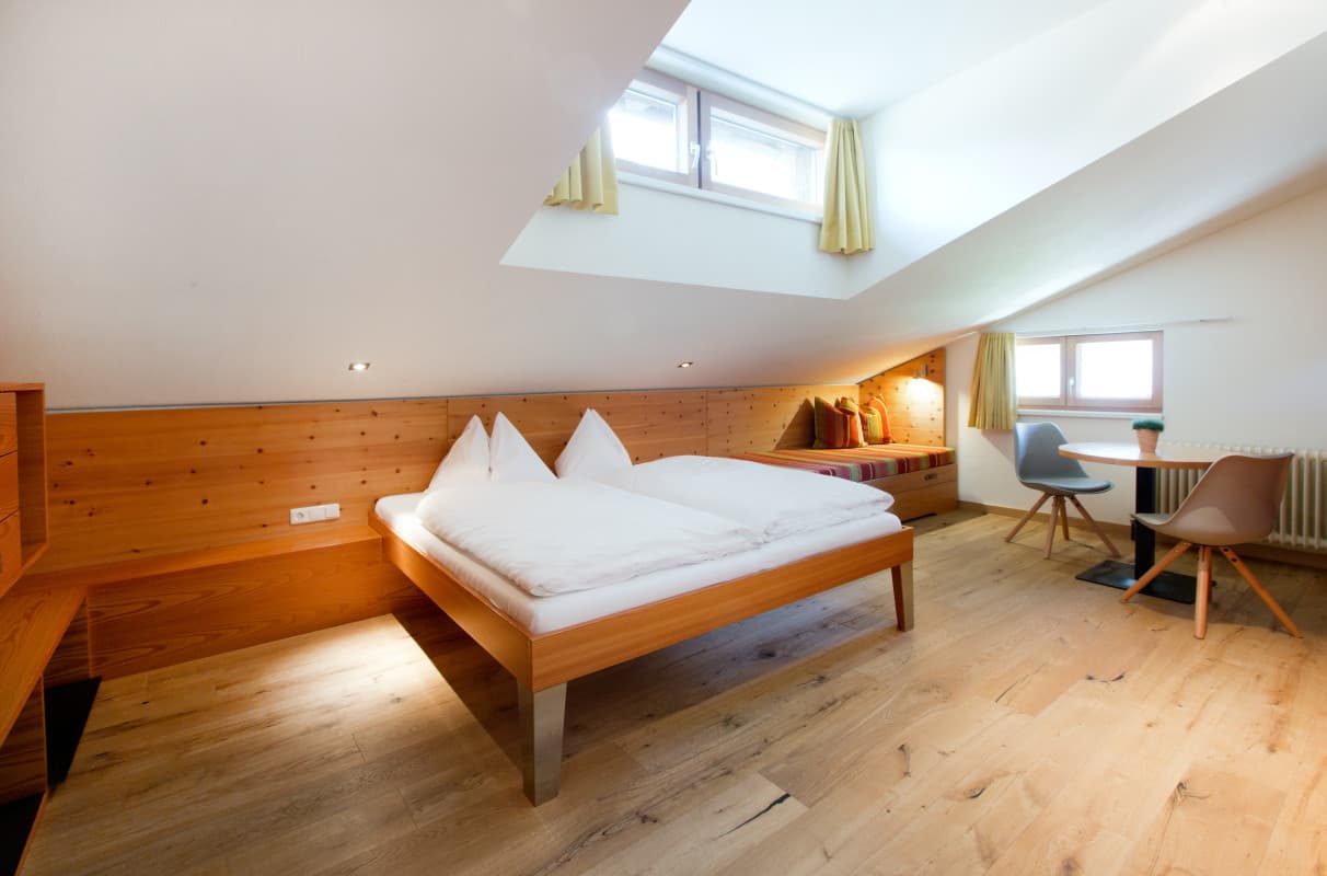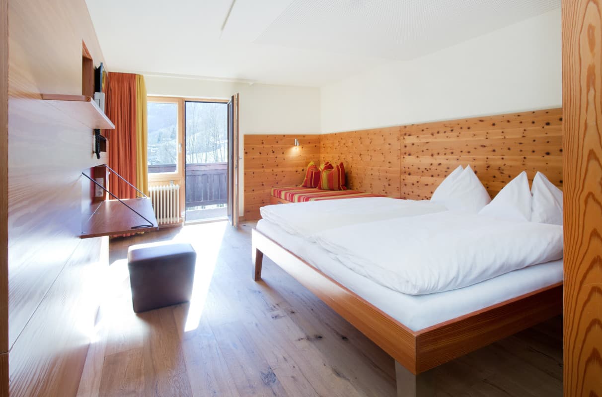 Das Familienzimmer fam 4 verfügt über 2 getrennte Schlaf-Wohn-Räume, ist mit einem Eichenholz-Parkettboden und teilweise mit Etagenbett für die Kinder ausgestattet und bietet Euch einen Balkon mit Aussicht nach Süden. Gemäß der fam Philosophie wurde bei der Gestaltung der Lagant-Zimmer auf die Bedürfnisse der Familiengäste und die Verwendung natürlicher Materialien geachtet. Die Zimmer sind mit Bad/Dusche, WC, Haarfön, Kosmetikspiegel, flauschigen Bademänteln, ausreichend Stauraum, Schreibtisch mit Hocker, Safe, modernem Flatscreen, WLAN und Telefon ausgestattet.