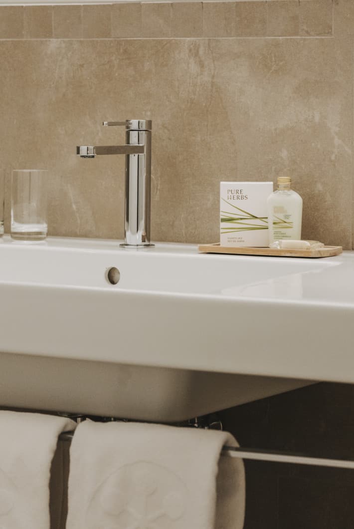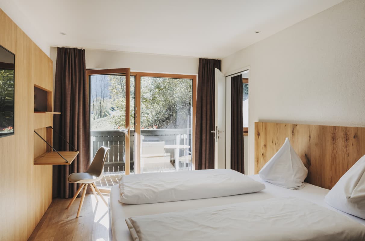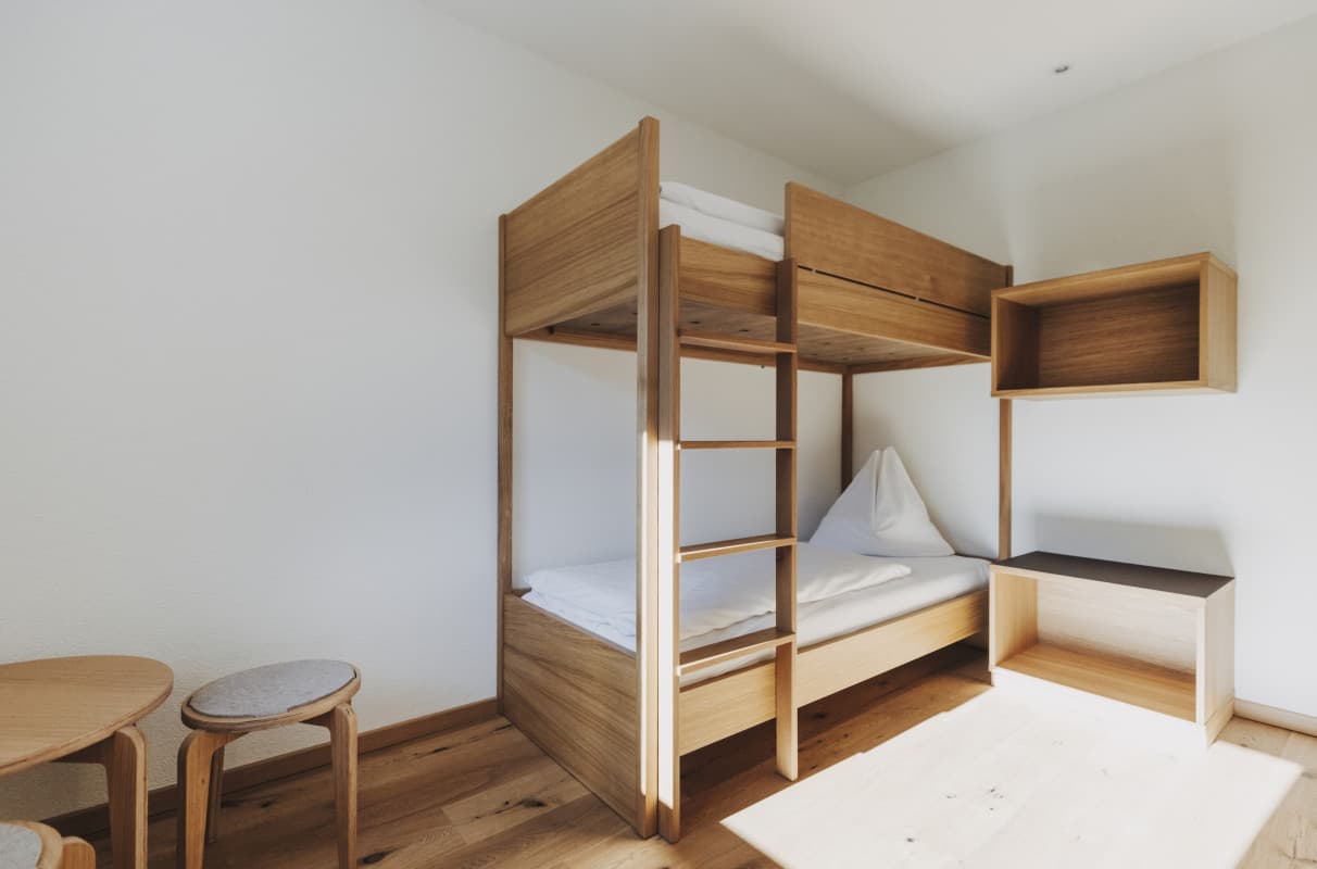 The Deluxe 1 family room has oak parquet flooring, 2 bedrooms with bunk beds for the children and a view to the north. In line with the fam philosophy, the Lagant rooms have been designed with the needs of family guests and the use of natural materials in mind. The rooms are equipped with bath/shower, WC, hairdryer, make-up mirror, fluffy bathrobes, ample storage space, desk with stool, safe, modern flatscreen TV, WLAN and telephone.