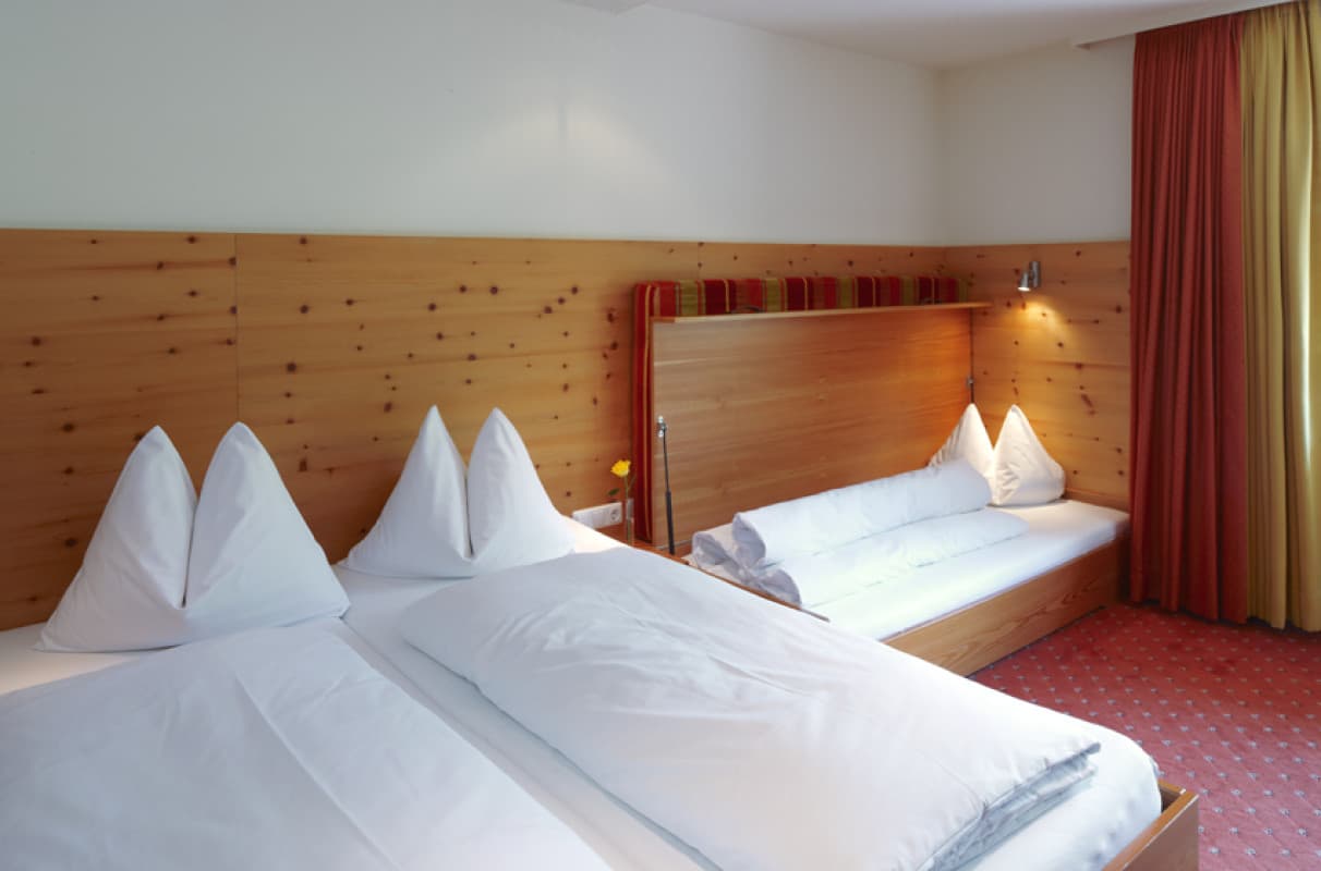 The family room fam 1 has a spacious living/sleeping area, a view to the east and a spacious balcony. In line with the fam philosophy, the Lagant rooms have been designed with the needs of family guests and the use of natural materials in mind. The rooms are equipped with bath/shower, WC, hairdryer, make-up mirror, fluffy bathrobes, ample storage space, desk with stool, safe, modern flatscreen TV, WLAN and telephone.