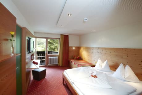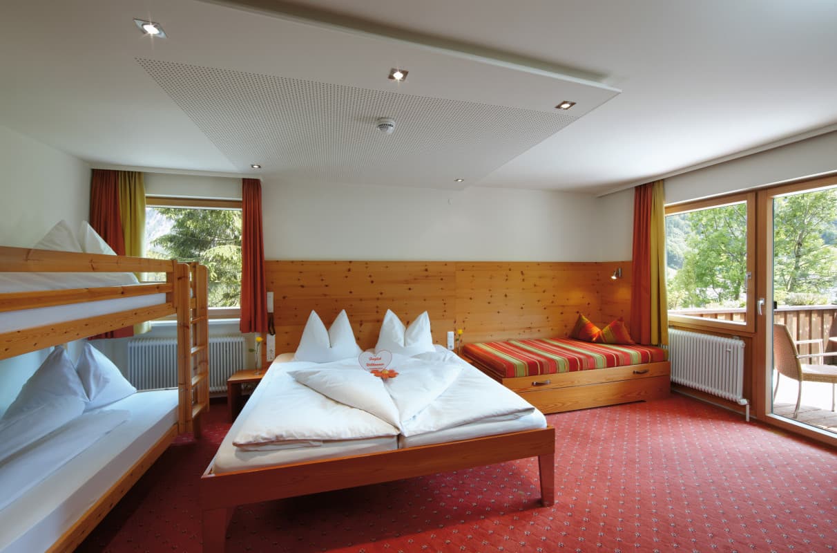 The family room fam 2 is equipped with an oak parquet floor and offers you a spacious balcony with a view to the south. In line with the fam philosophy, the Lagant rooms have been designed with the needs of family guests and the use of natural materials in mind. The rooms are equipped with bath/shower, WC, hairdryer, make-up mirror, fluffy bathrobes, ample storage space, desk with stool, safe, modern flatscreen TV, WLAN and telephone.