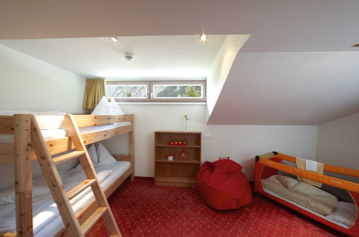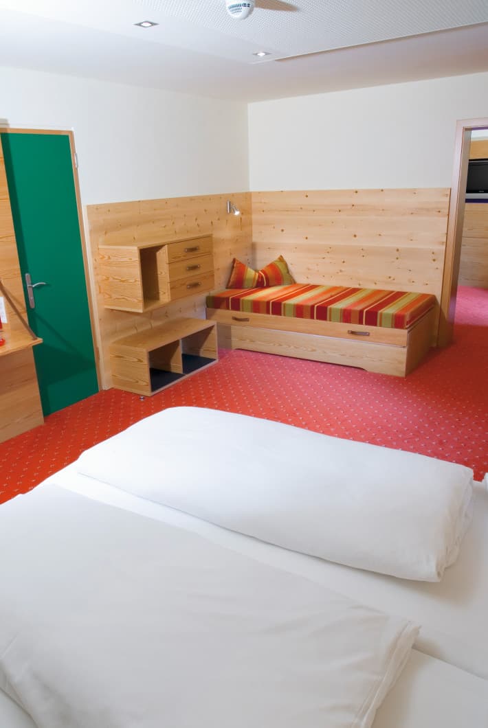 The fam 4 family room has 2 separate sleeping/living areas, is partly equipped with bunk beds for the children and offers you a balcony with a view to the south. In line with the fam philosophy, the Lagant rooms have been designed with the needs of family guests and the use of natural materials in mind. The rooms are equipped with bath/shower, WC, hairdryer, make-up mirror, fluffy bathrobes, ample storage space, desk with stool, safe, modern flatscreen TV, WLAN and telephone.